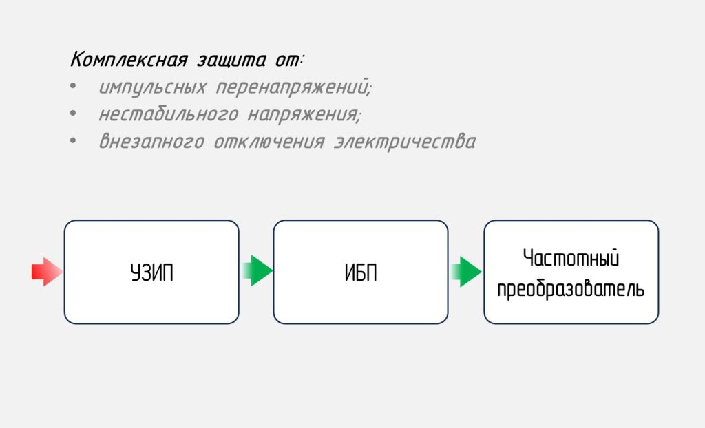 - для защиты от импульсных высоковольтных всплесков, отключений электроэнергии, скачков и просадок напряжения, такая – УЗИП – ИБП – частотный преобразователь.