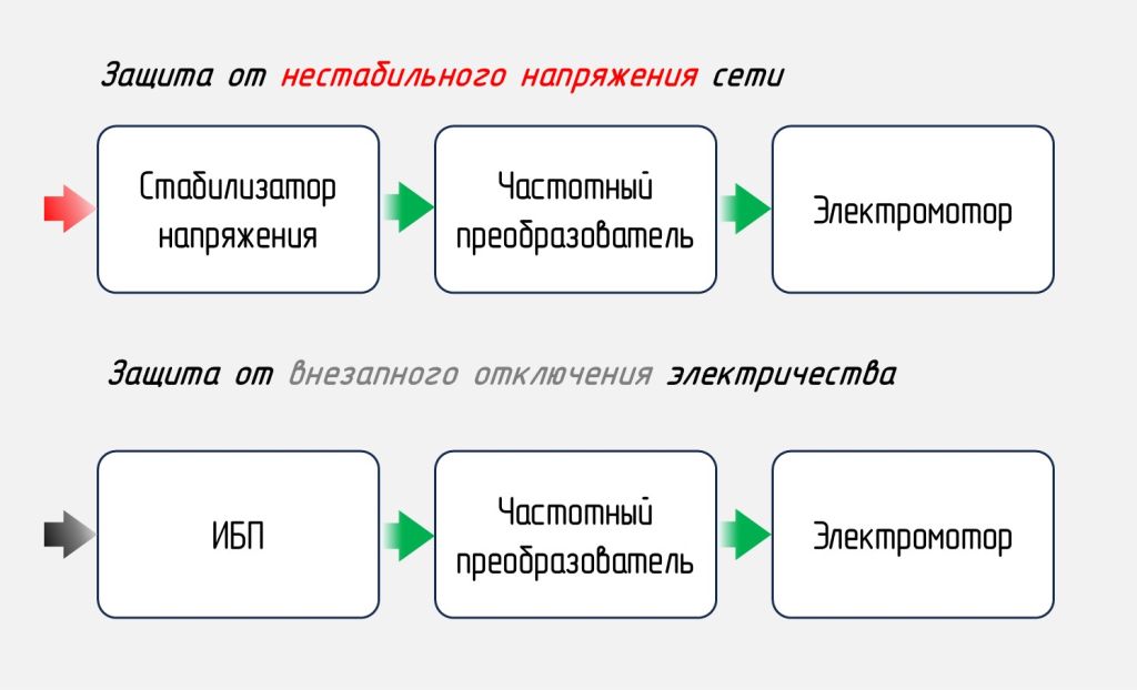 - для защиты от импульсных высоковольтных всплесков, скачков и просадок напряжения применяется такая комбинация – УЗИП – стабилизатор напряжения – частотный преобразователь;